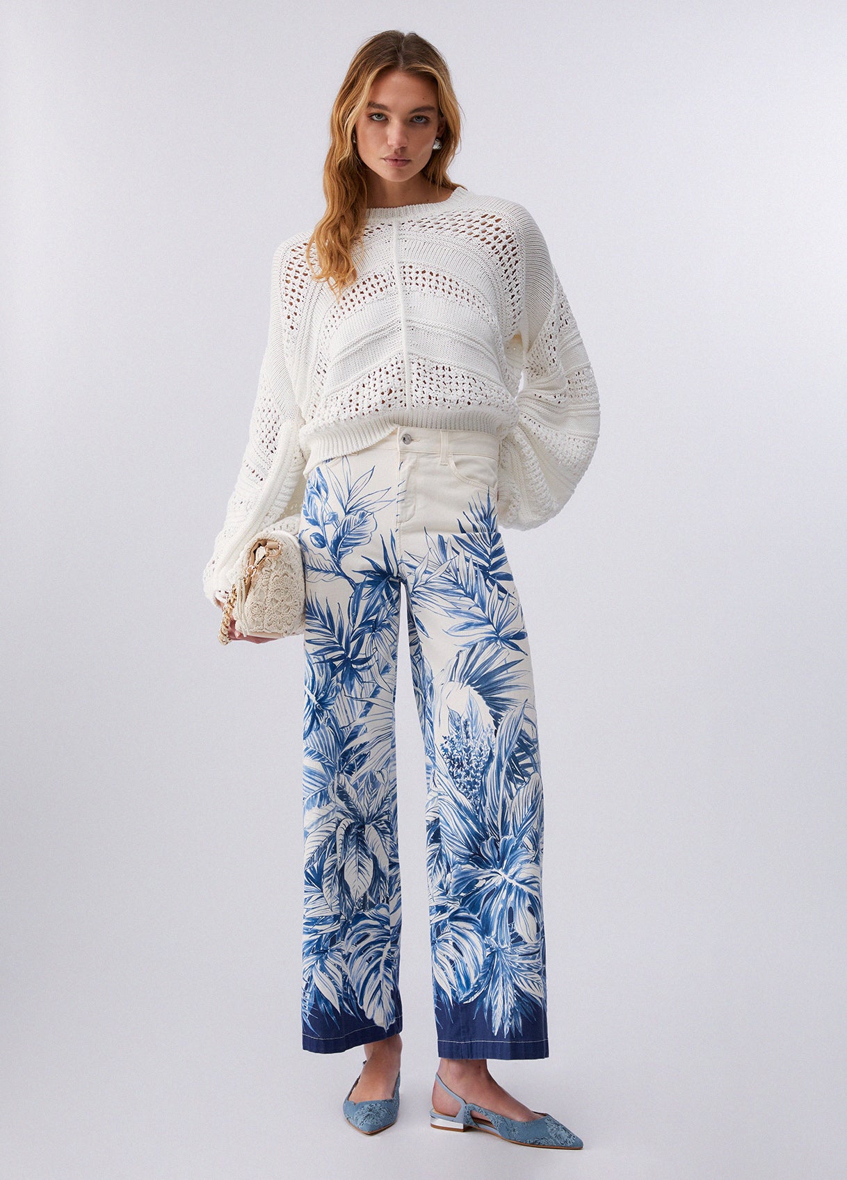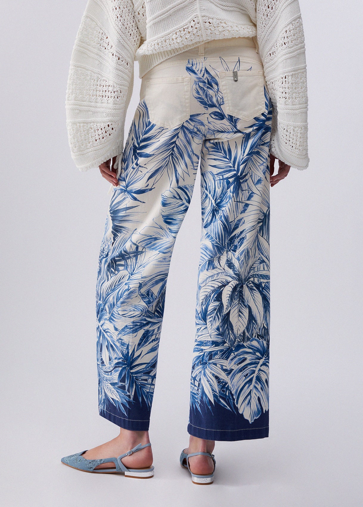 FLARED BOTTOM UP FALMLEAF PRINT TROUSER WHITE