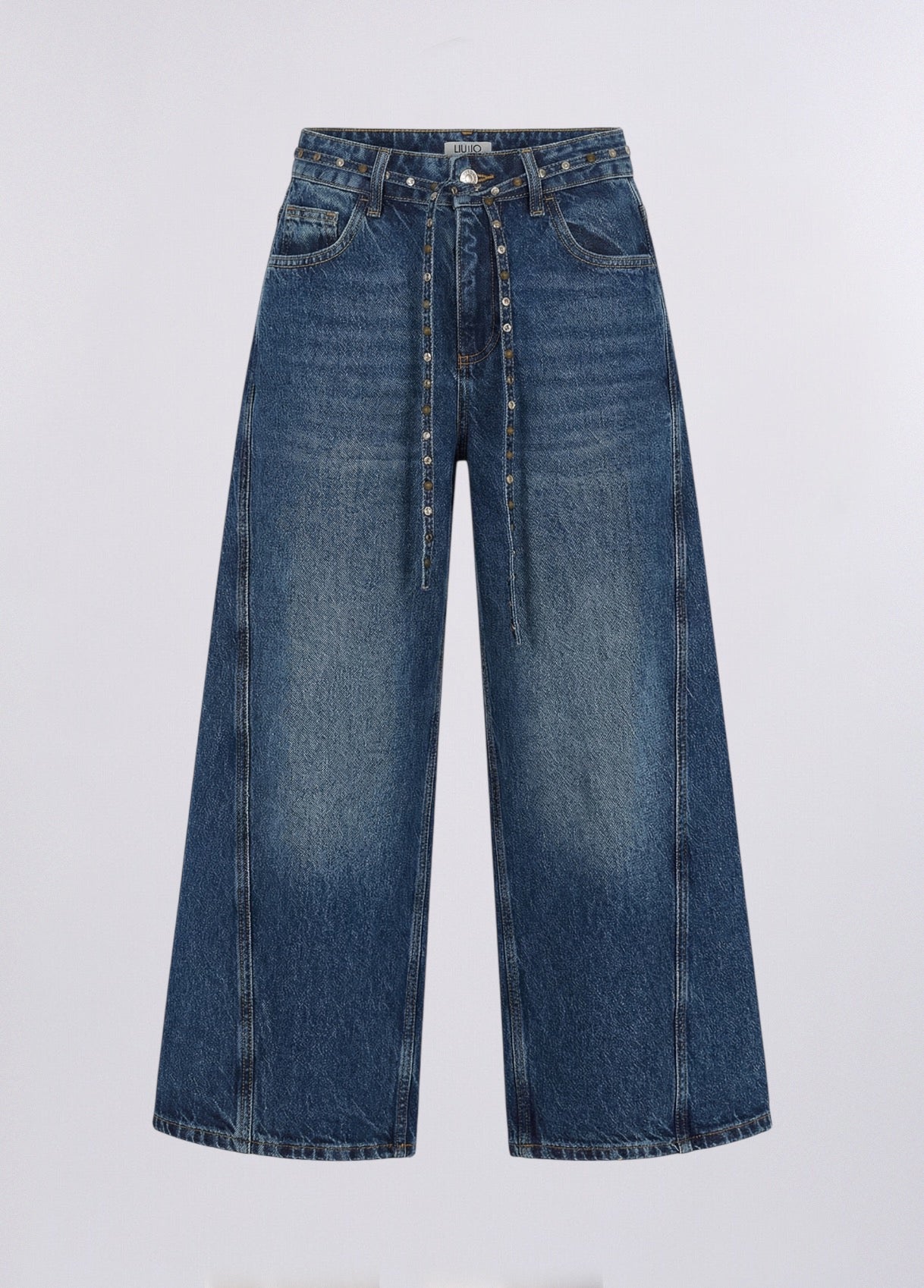 HIGH WAIST CROPPED WIDE LEG DENIM WITH STUDDED BELT DARK BLUE