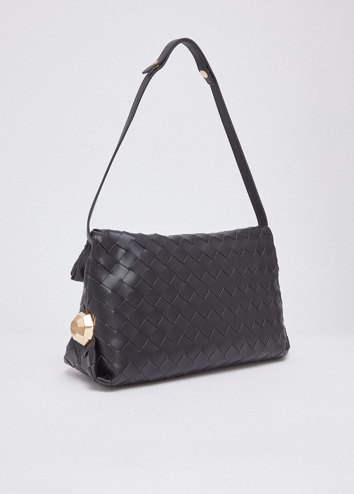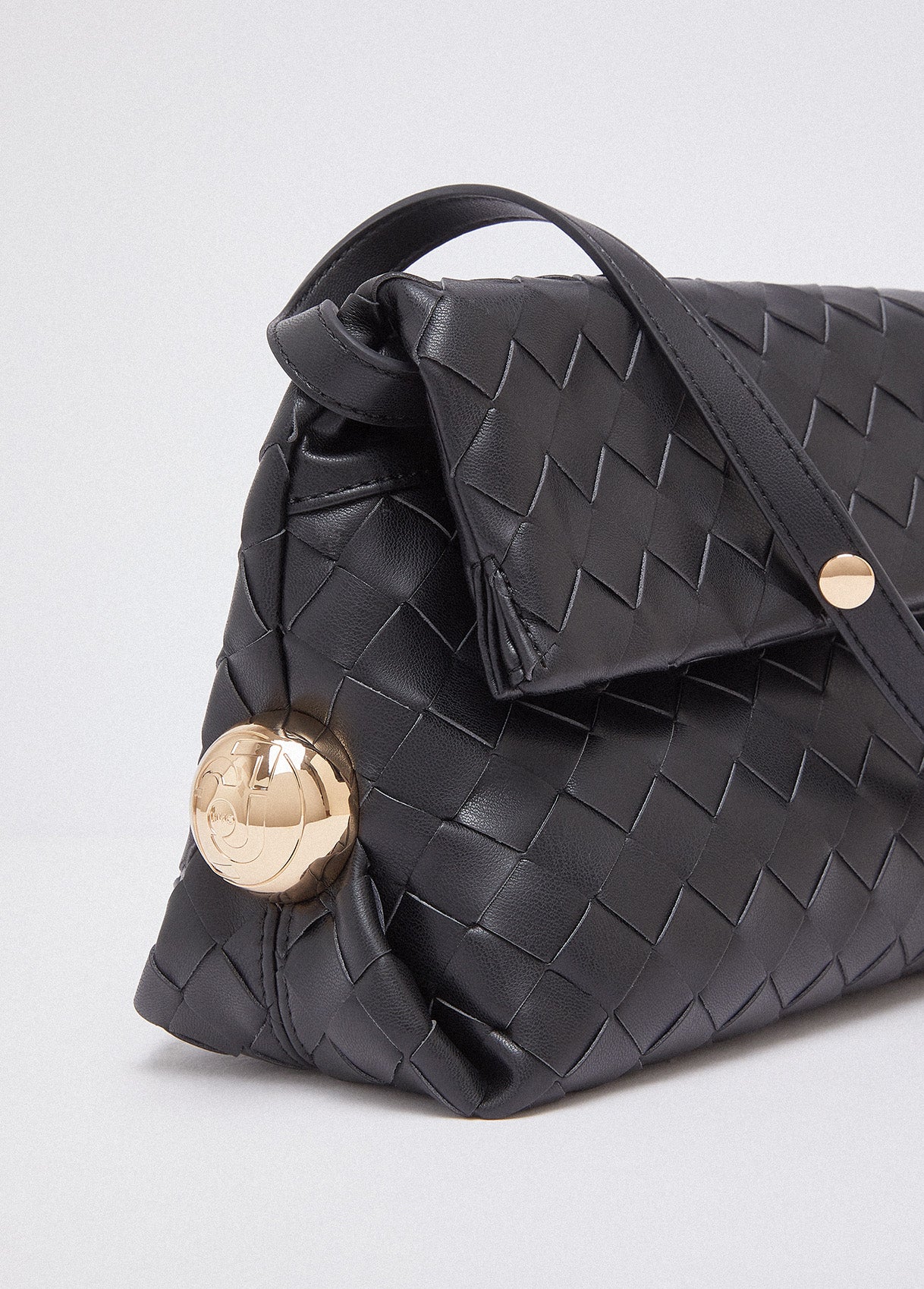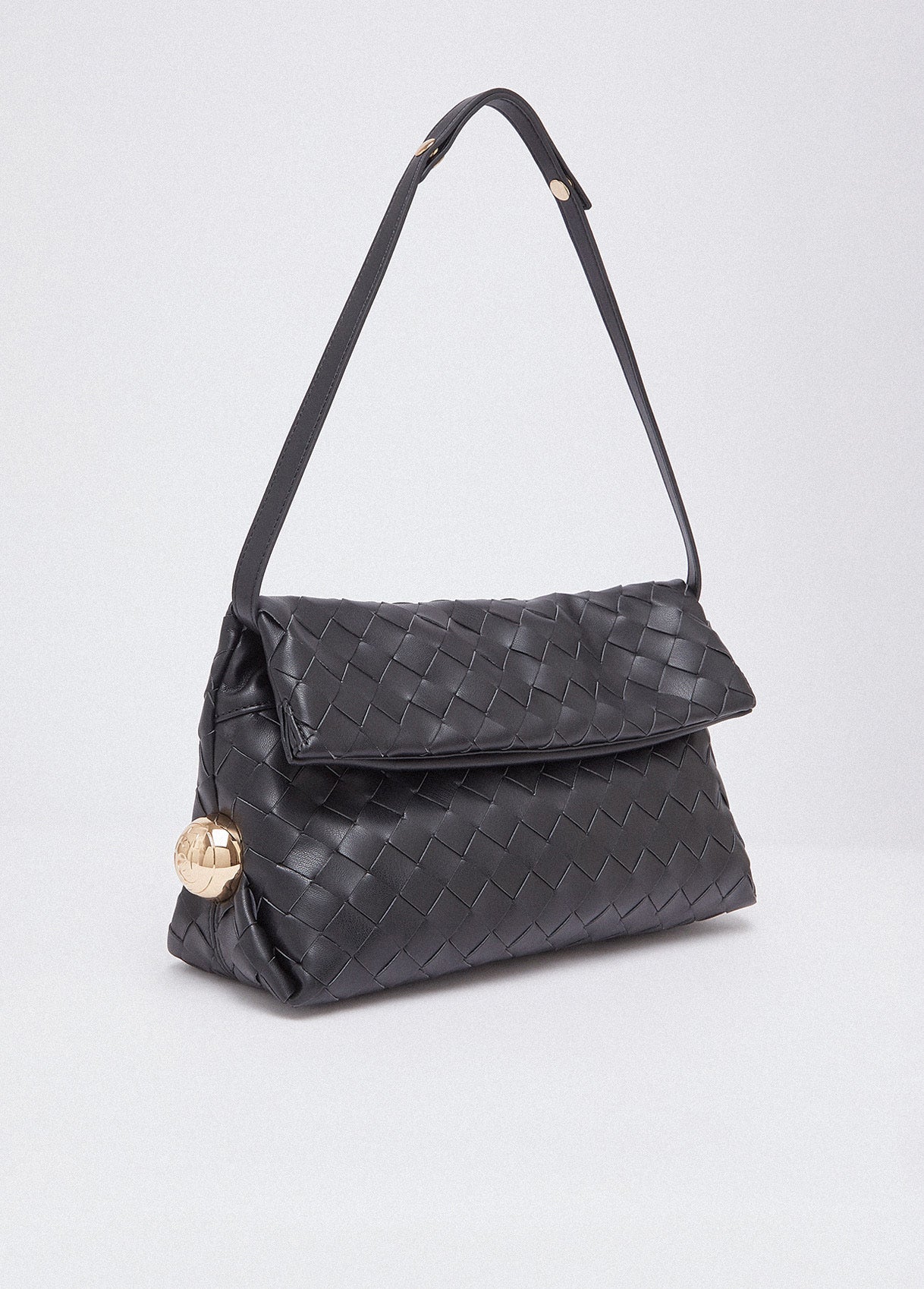 Essential, textured, this black Riccy Bag captivates with its soft woven design that gives the surface a refined sense of movement. Bold side details catch the light like small sculptural accents. Wear it on the shoulder or as a clutch for your most polished looks.