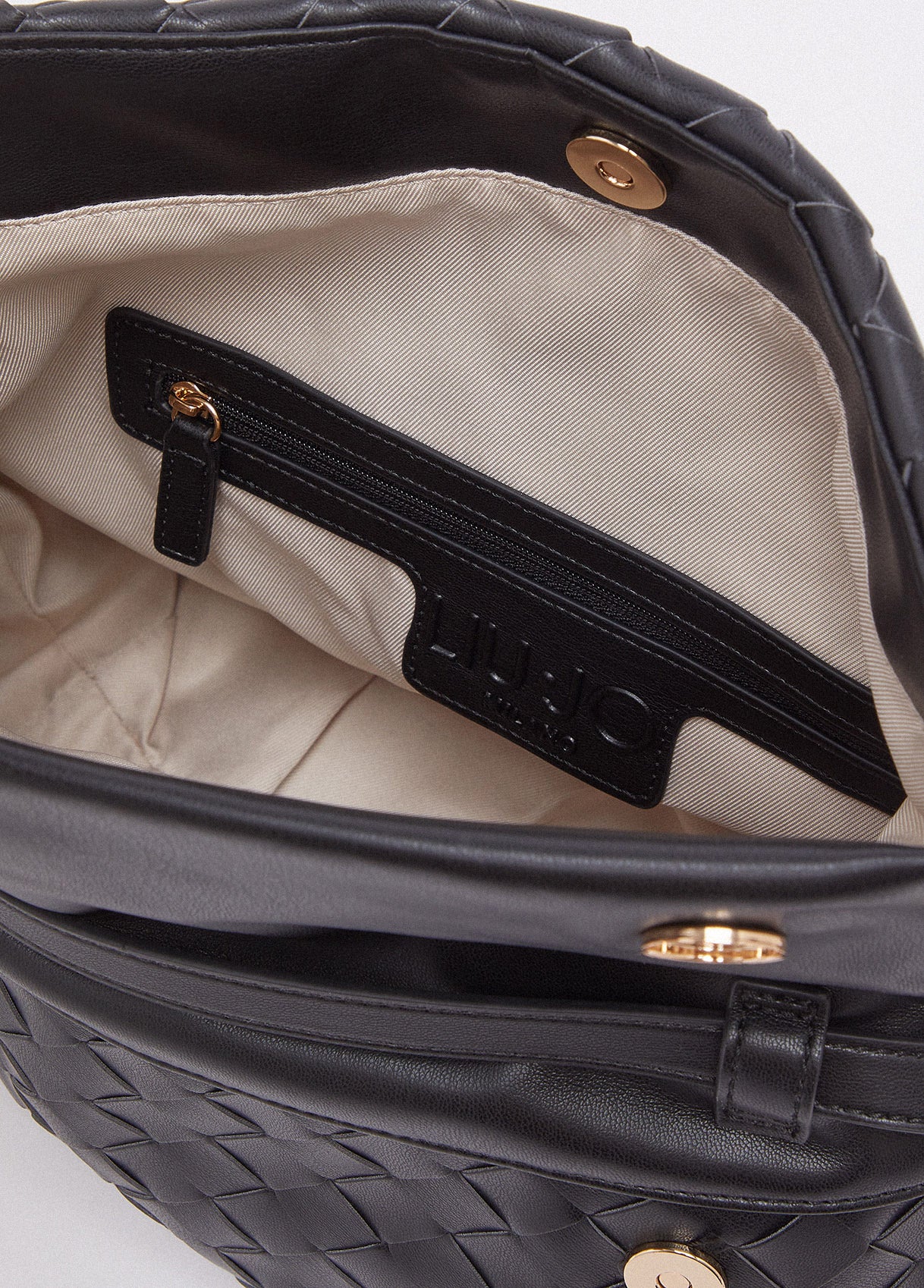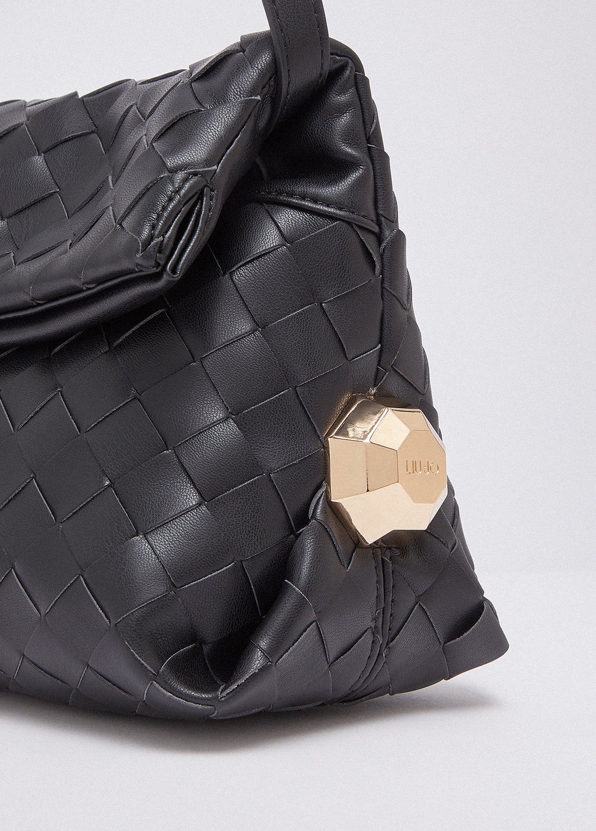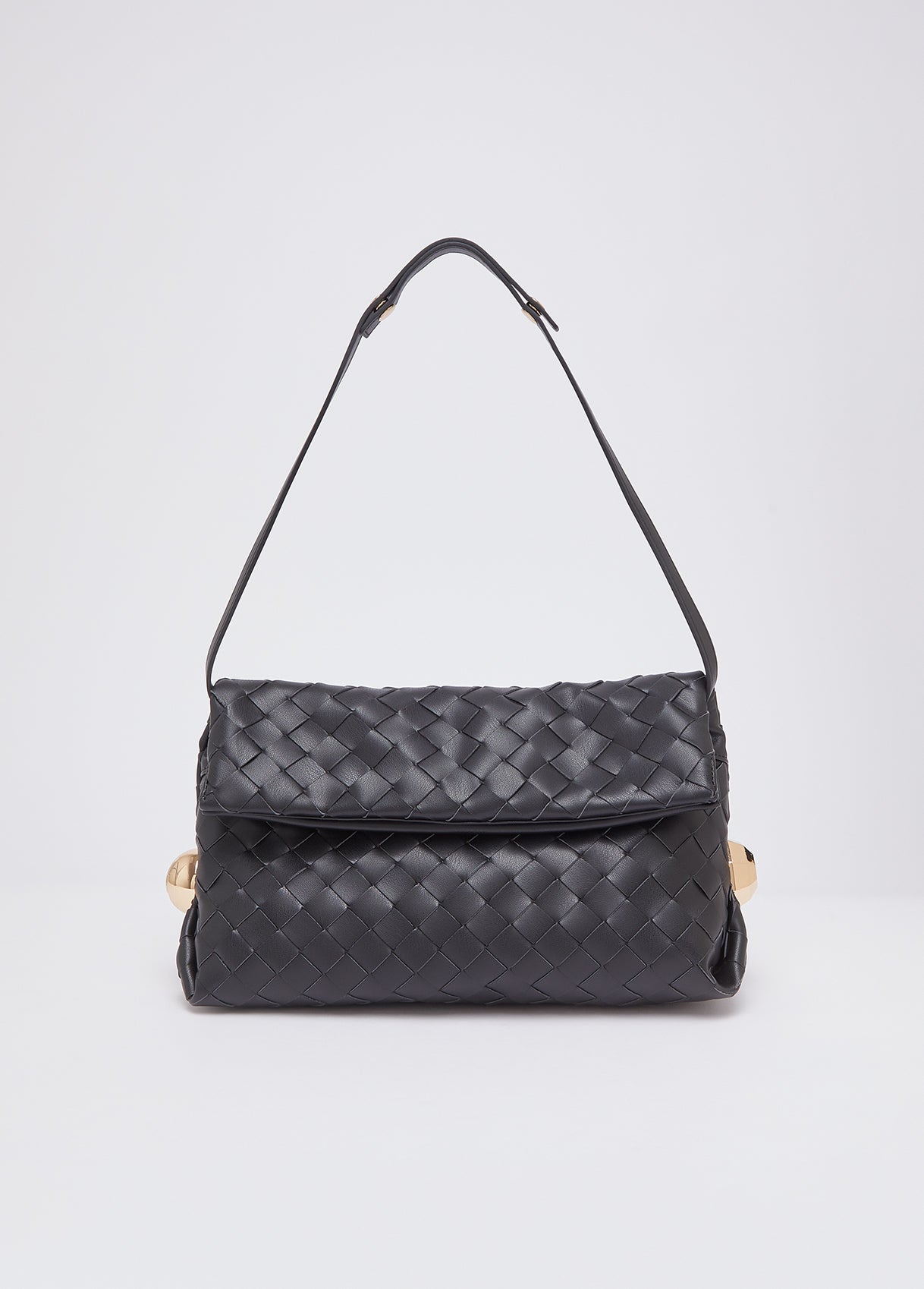 Essential, textured, this black Riccy Bag captivates with its soft woven design that gives the surface a refined sense of movement. Bold side details catch the light like small sculptural accents. Wear it on the shoulder or as a clutch for your most polished looks.